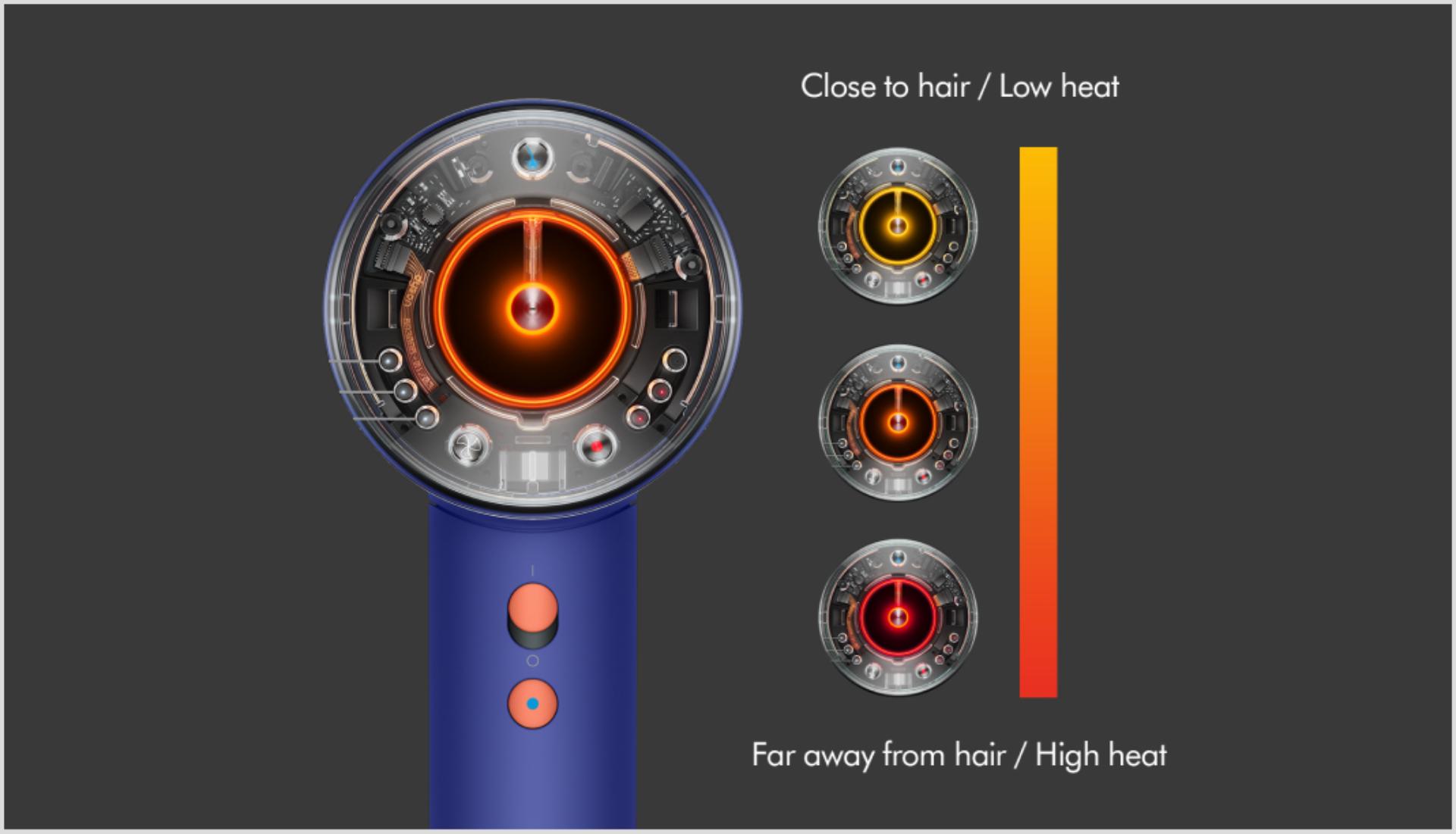 Температура воздуха автоматически снижается по мере приближения к волосам и коже головы. Поддерживает температуру 55°C на коже головы для бережной сушки вблизи и улучшенного теплового комфорта. 2